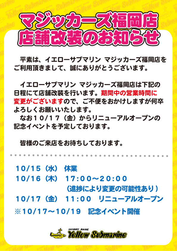 イエローサブマリン マジッカーズ福岡店は下記の日程にて店舗改装を行います。